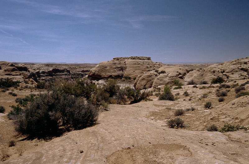 Nach 2 Meilen die Hochspannungsleitung, die Strasse biegt langsam in nordwestliche Richtung um. Links folgen die grauen, nicht allzu hohen Blue Hills, rechts die graue Ebene. Einen Schönheitspreis gewinnt die Gegend nicht! Sieben Meilen von der US 191 in etwa, dann erreichen wir eine Kreuzung (12S 0600141, 4293013).Die Dubinky Well Road zweigt nach rechts ab und wir folgen dieser historischen Route auf Island in the Sky, die Besucher in den Park brachte bevor die moderne UT 313 durch den Seven Mile Canyon gebaut wurde. Auch hier geht es noch mit dem Pkw weiter. Die Blue Hills werden durchquert, es wandelt sich die Landschaft. Weite Blicke nach Westen sind gelegentlich möglich. Zur Rechten werden die gestreiften, sanften Cliffs der Rainbow Rocks sichtbar - eine andere Geschichte!